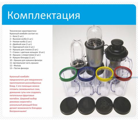 Хотите удивить гостей великолепными блюдами и изысканными напитками на ужине или домашней вечеринке? Любите разнообразное питание, но не хотите часами проводить время у плиты? Приобретайте кухонный комбайн «Волшебная пуля» и вы сможете с легкостью приготовить сотни различных блюд и напитков, удивляя своих близких и друзей кулинарным мастерством. Салаты, супы, омлеты, фруктовое пюре, коктейли и многое другое будут ежедневно украшать Ваш стол. Простой в использовании комбайн «Волшебная пуля» – это незаменимая техника для Вашей кухни.