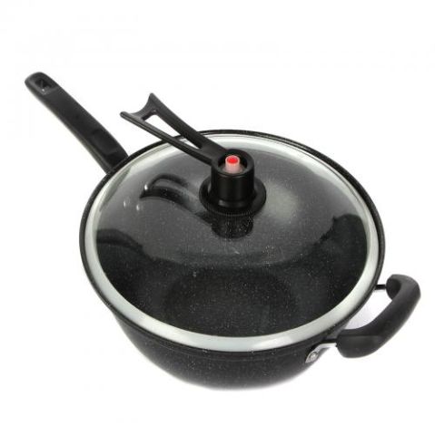 Сковорода ВОК сделана из дюрали алюминия с высококачественным антипригарным каменным покрытием. Камень не содержит вредных примессей, что способствует здоровому и эко логичному приготовлению пищи. Кроме того, с таким покрытием пища не приговает и не прилипает к скенкам, поэтому можно готовить с минимальным добавлением масла и жаров. Гладкая, идеально ровная поверхность сковороды ВОК легко чистится, ее можно мыть в воде без моющих средств и протирать полотенцем. Внешнее покрытие - Greblon Германия добавляет прочность сковороде ВОК Утонченная стенка сковороды ВОКбыстро нагревается и тем самым обеспечивает быстрое приготовление продуктов. Сковорода ВОК хорошо подходит для готовки на открытом огне и пассерование в кипящем масле. Любая хозяйка однажды попробовав приготовление в сковороде Вок, полюбит эту посуду и оценит ее качество.