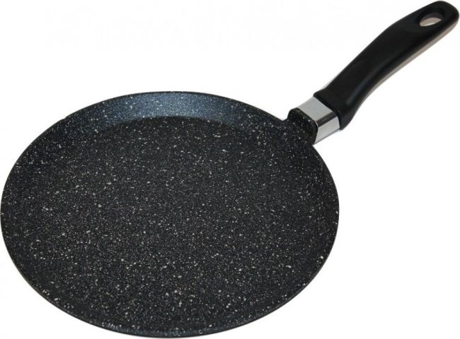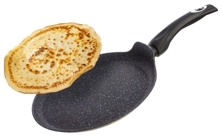 Блинная сковорода с мраморным антипригарным покрытием изготовлена по самым современным технологиям. Ее форма позволяет печь блины, как заправскому повару, с подкидыванием их в воздух для переворачивания.