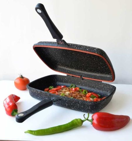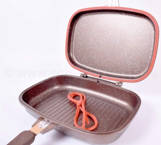 Обжаривать можно с двух сторон. Удобные ручки позволят переворачивать сковороду. Сковорода двухсторонняя предназначена для готовки различных блюд: мяса, рыбы и т. Д. А какая вкусная получается жареная картошка, и не нужно мешать и бояться, что подгорит. Достаточно поставить сковороду на огонь и можно приступать к готовке любимых блюд. Между крышками находится силиконовое уплотнение, которое не пропускает воду или масло. Сковорода двухсторонняя станет отличным подарком теще или жене на любой праздник.
