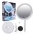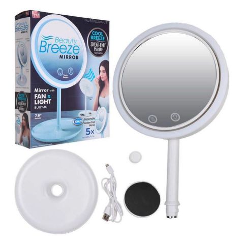 - Комплектация: зеркало косметическое с вентилятором и встроенной кольцевой лампой, съемное зеркало 5х увеличение, USB – провод, подставка